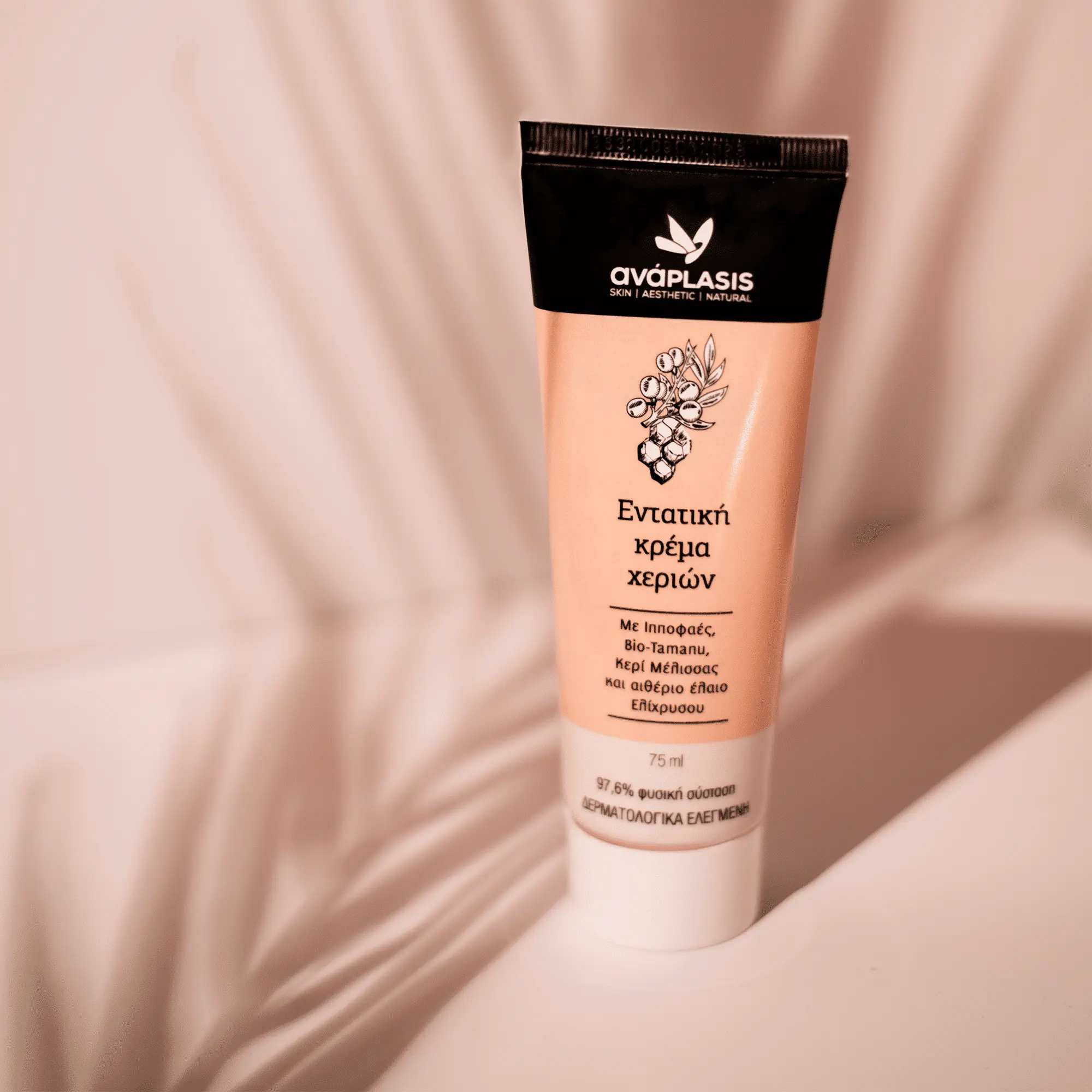 Η Εντατική Κρέμα Χεριών - Με Ιπποφαές, Bio-Tamanu, Κερί Μέλισσας και αιθέριο έλαιο Ελίχρυσου της εταιρίας ANAPLASIS, χάρη στα επιλεγμένα φυσικά συστατικά της, βοηθά στη γρηγορότερη επαναφορά της επιδερμίδας των χεριών.