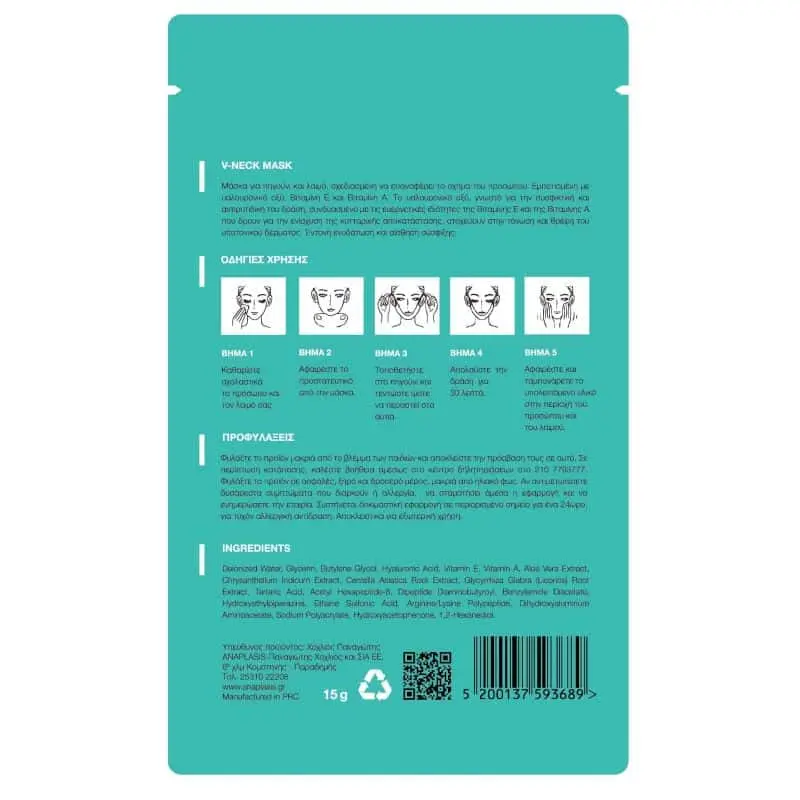 Συσφικτική μάσκα για πηγούνι και λαιμό με υαλουρονικό οξύ, Βιταμίνη Ε και Βιταμίνη Α.
