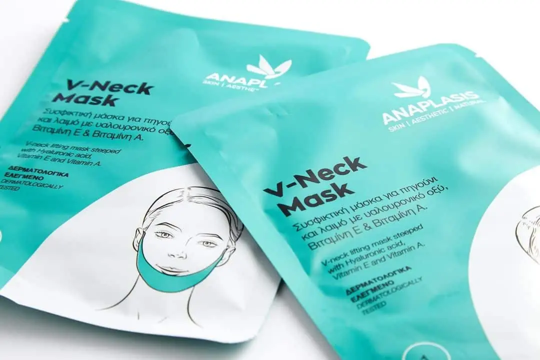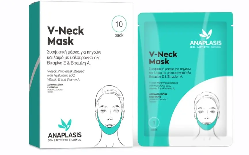 Συσφικτική μάσκα για πηγούνι και λαιμό με υαλουρονικό οξύ, Βιταμίνη Ε και Βιταμίνη Α.